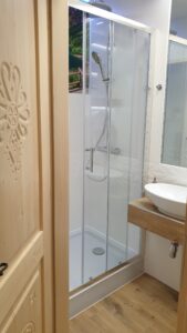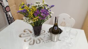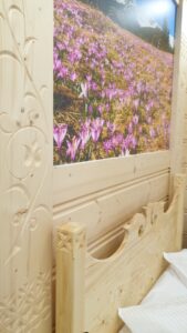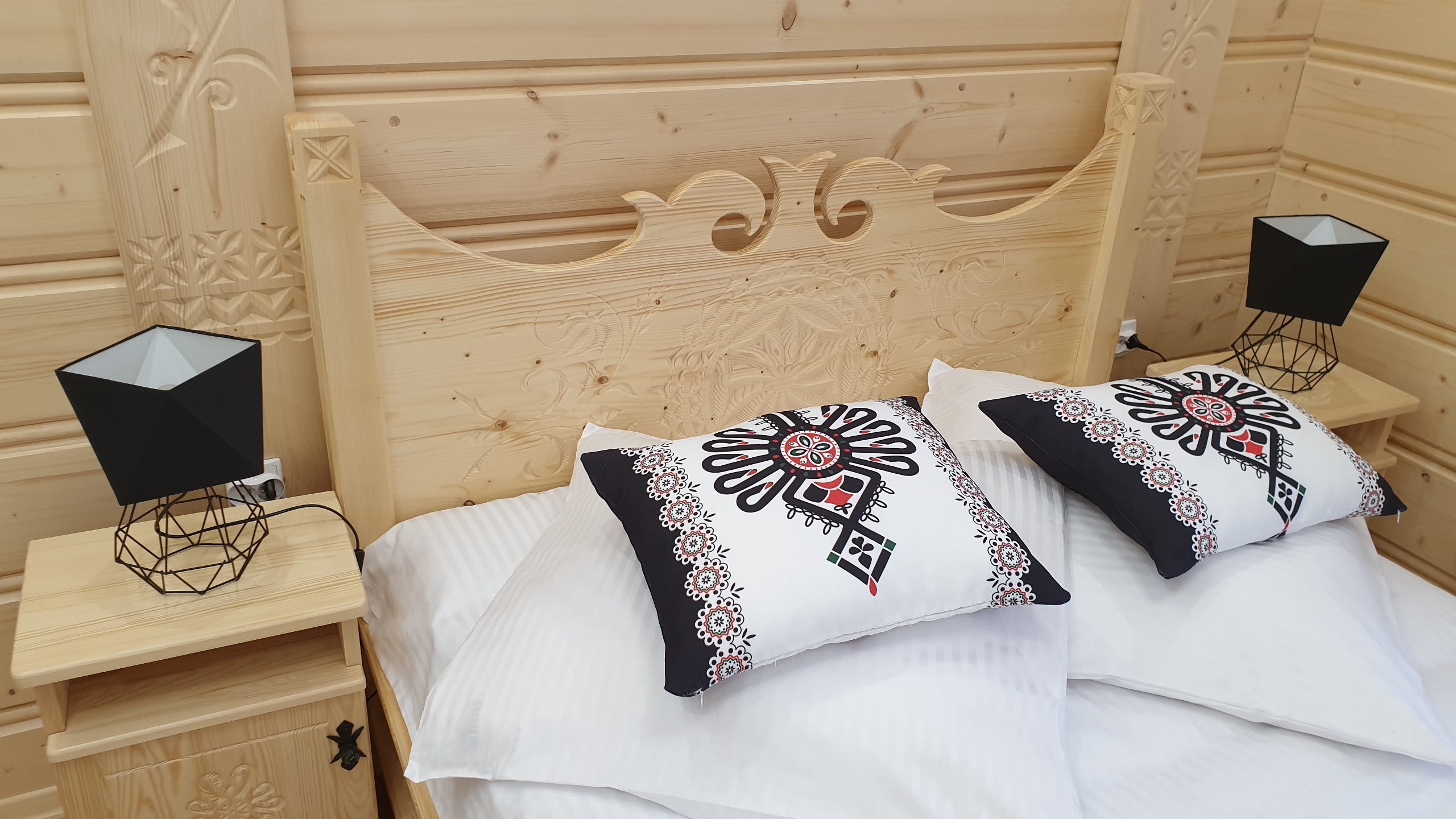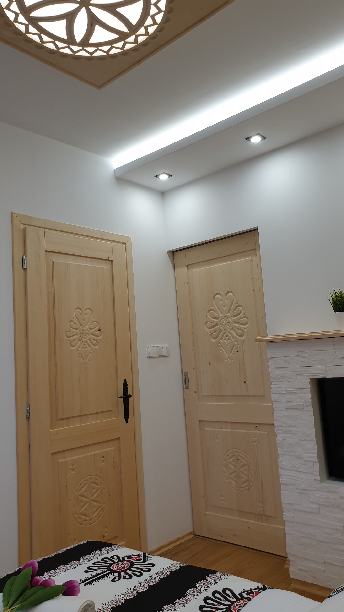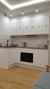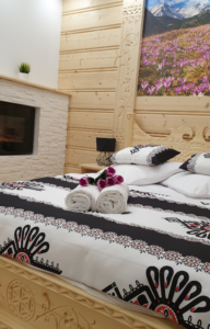 Apartament usytuowany jest na 1 piętrze willi. W apartamencie znajduje się łazienka, aneks kuchenny, część wypoczynkowa z kanapa (z funkcją spania dla 2 dzieci) i smart TV 55″ 4K oraz oddzielna sypialnia wyposażona w stylowe regionalne łoże dla 2 osób oraz kominek elektryczny.