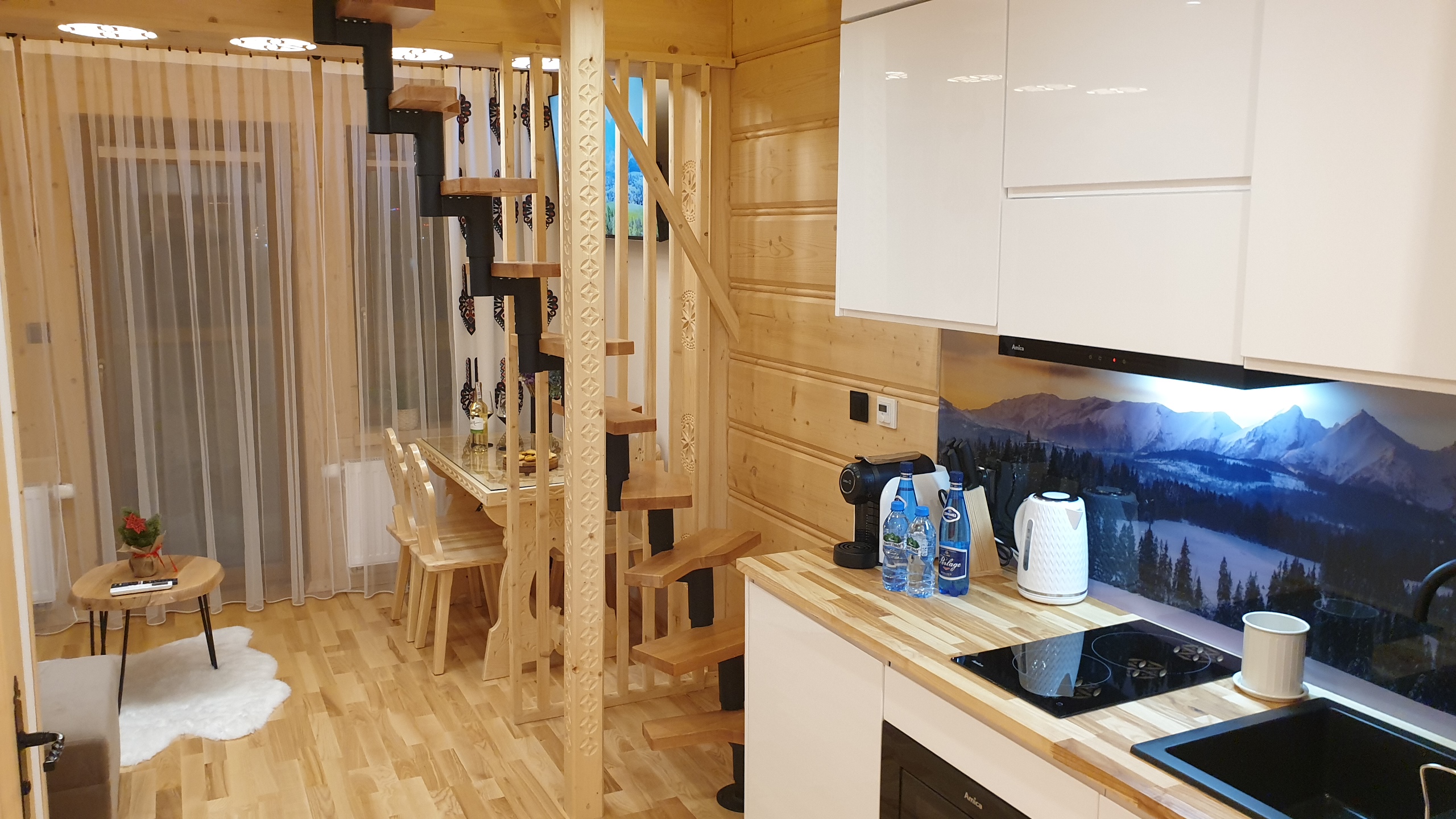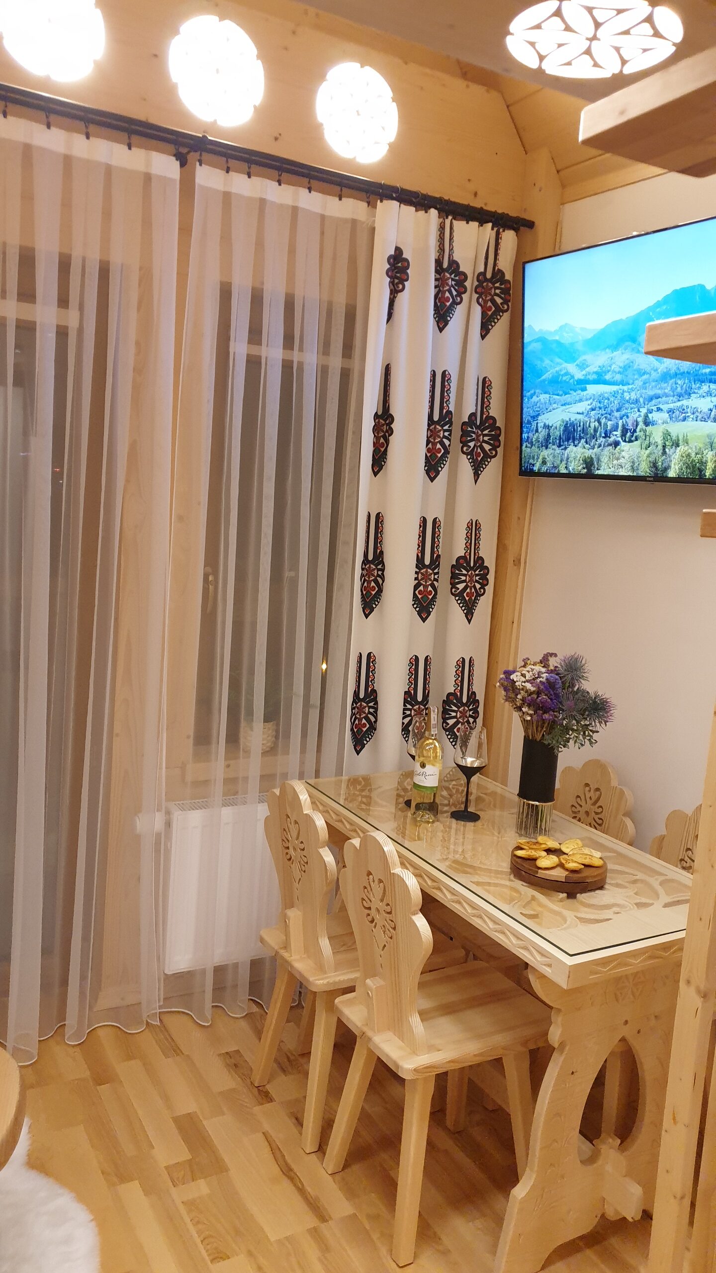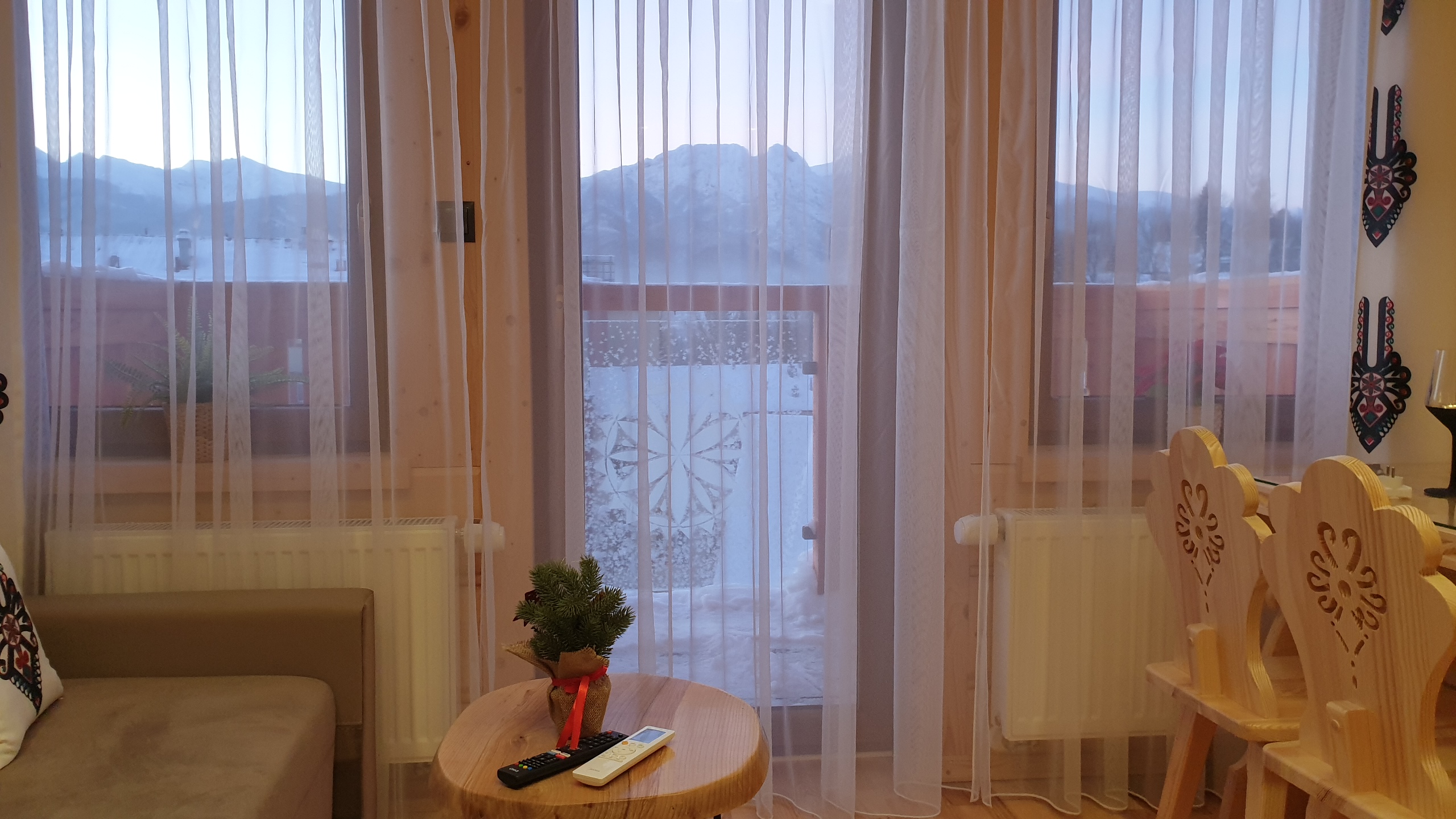Apartament dwuzpoziomowy z antresolą posiadający balkon z pięknym widokiem na panoramę Tatr oraz Gubałówkę. Apartament jest wykończony z naturalnych materiałów w stylu regionalnym a zarazem z komfortowym wyposażeniem.