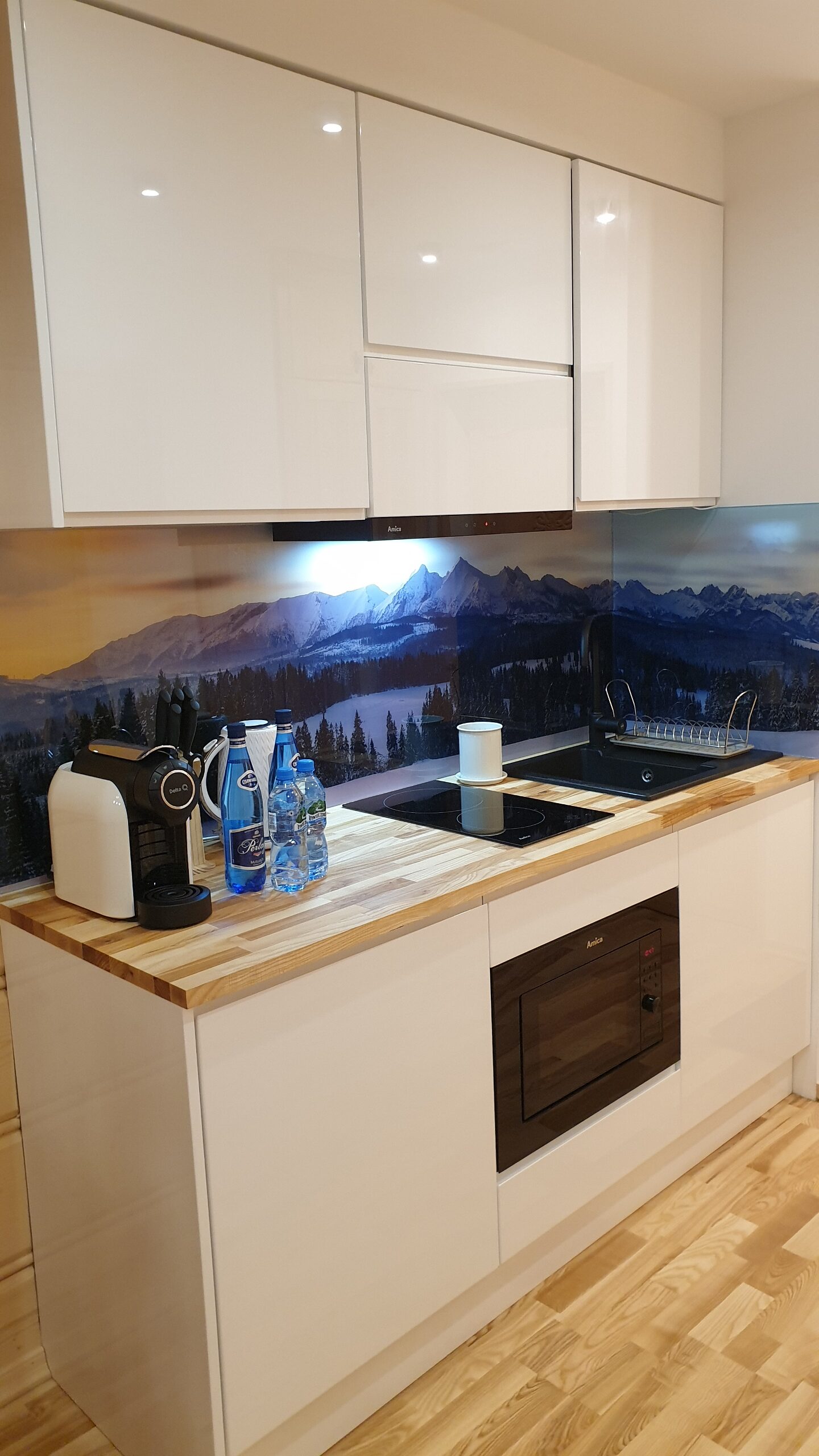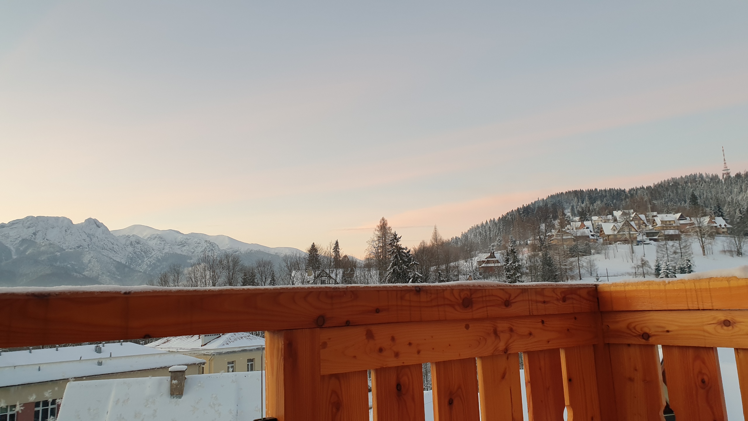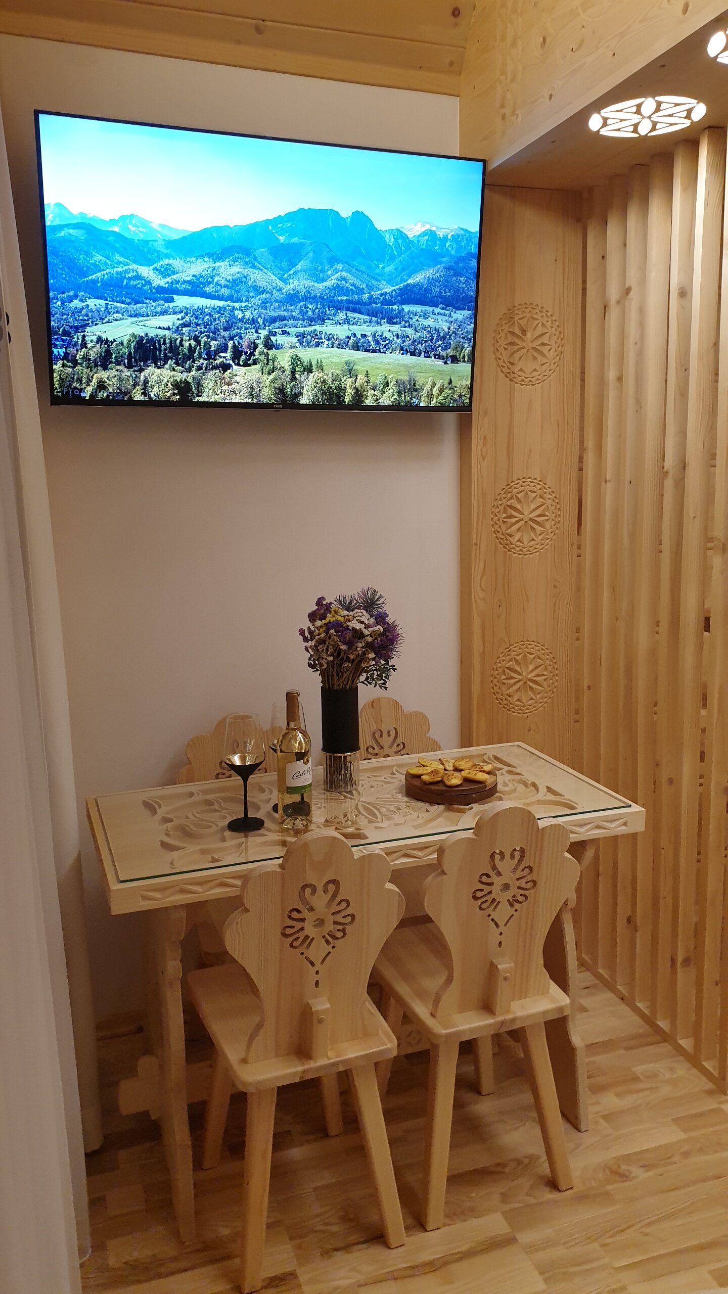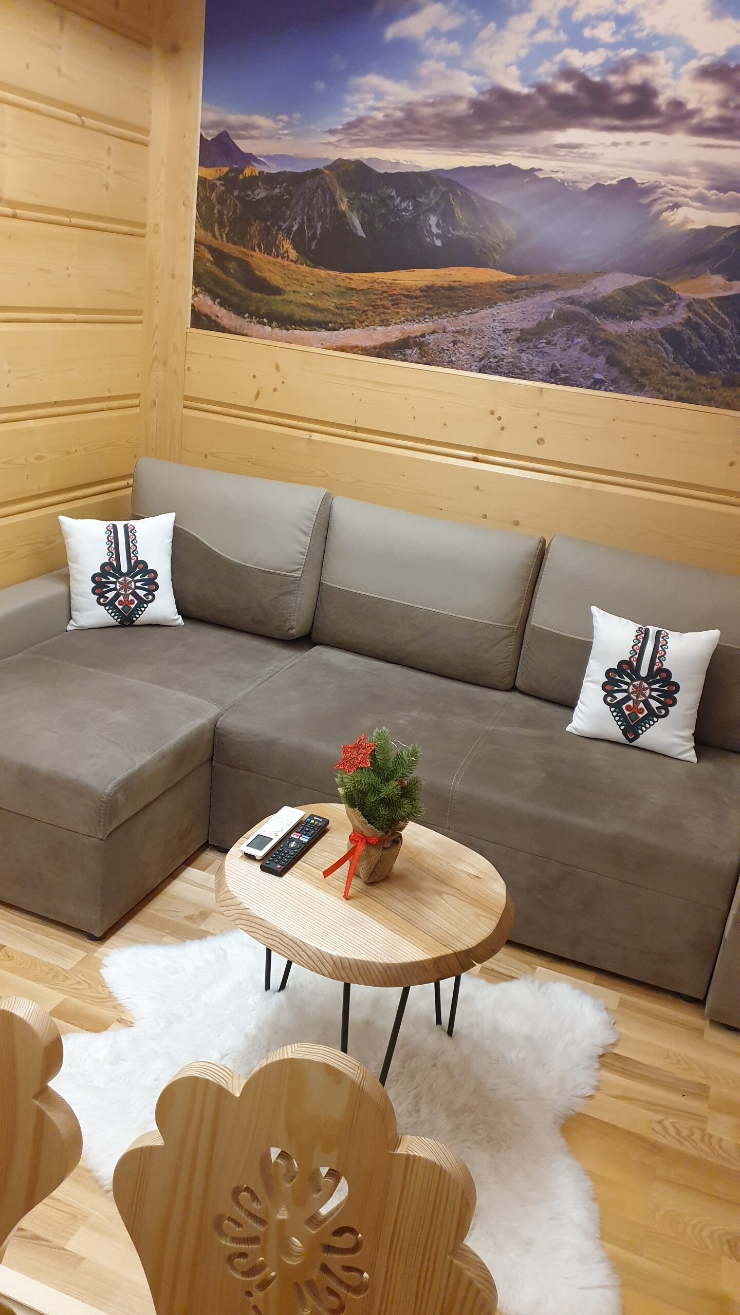 Apartament dwuzpoziomowy z antresolą posiadający balkon z pięknym widokiem na panoramę Tatr oraz Gubałówkę. Apartament jest wykończony z naturalnych materiałów w stylu regionalnym a zarazem z komfortowym wyposażeniem.