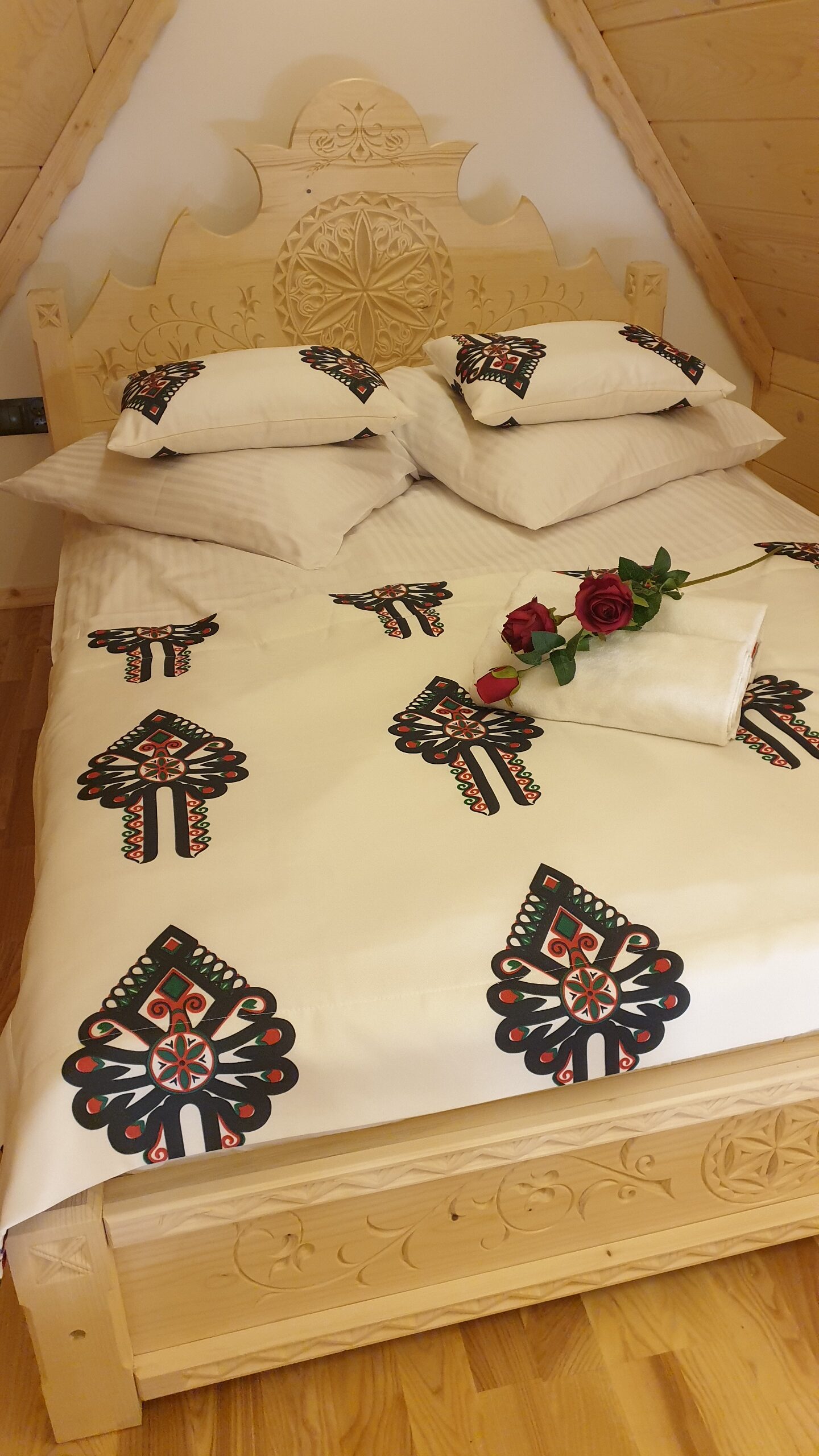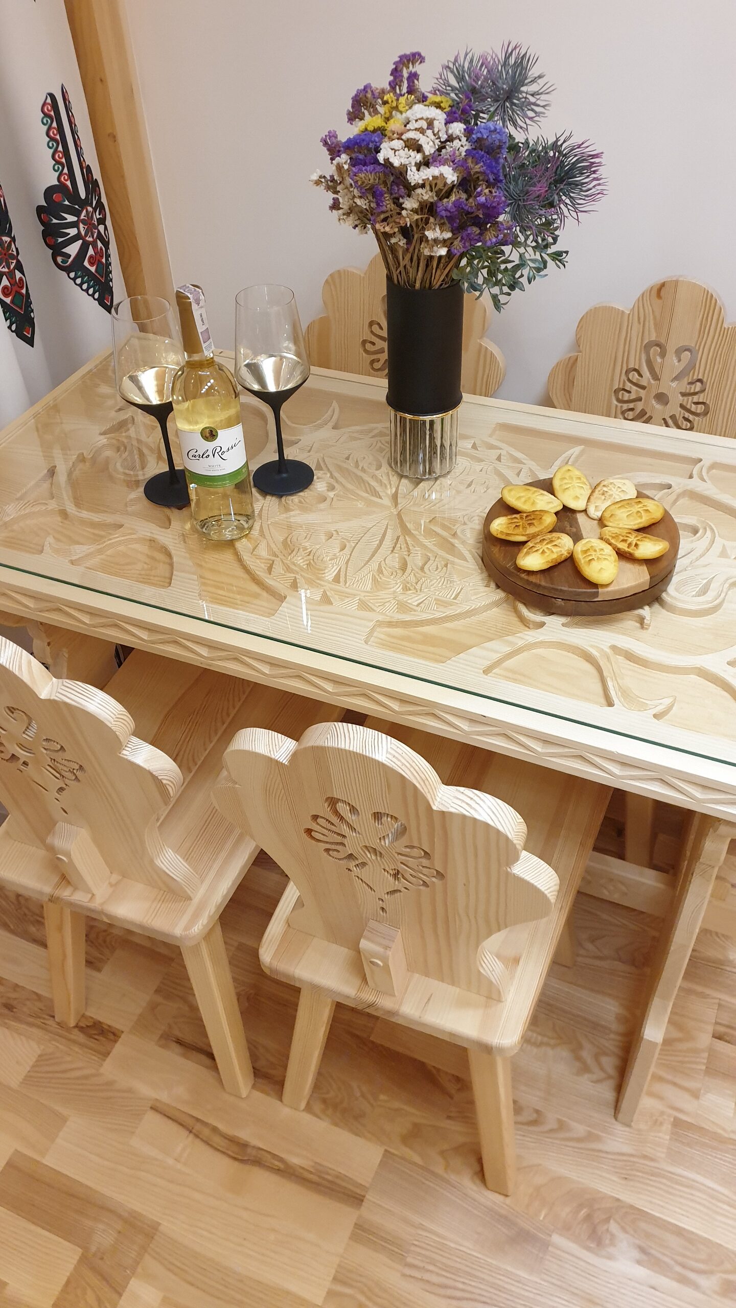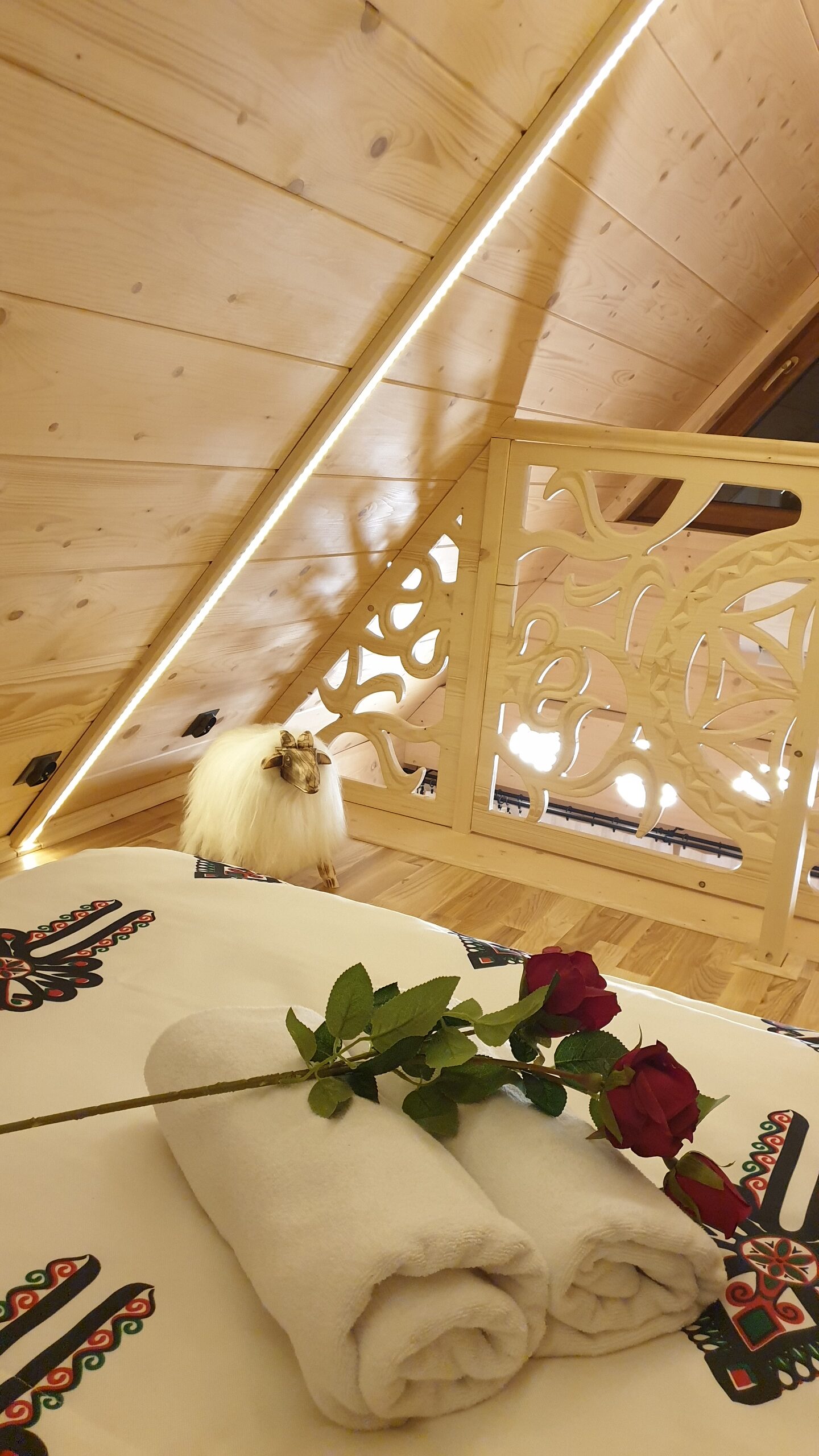 Apartament usytuowany jest na 2 piętrze willi. W apartamencie znajduje się łazienka, aneks kuchenny oraz część wypoczynkowa z narożnikiem (z funkcją spania dla 2 dzieci) i smart TV 50″. Na antresoli znajduje się stylowe regionalne łoże dla 2 osób.